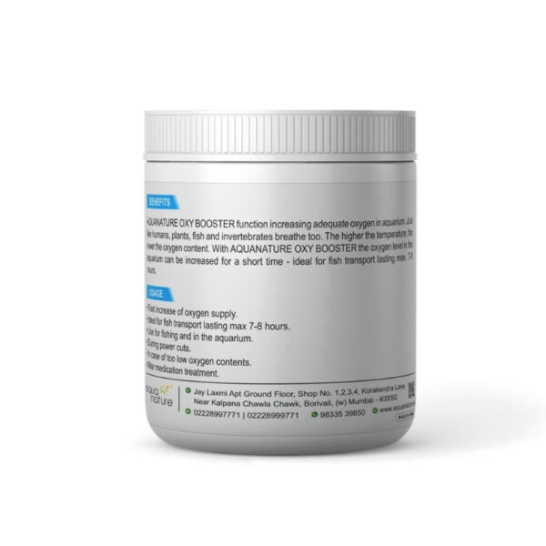 Aquanature Oxy Booster provides a quick increase in oxygen levels for a short period, making it ideal for fish transport lasting up to 7–8 hours.