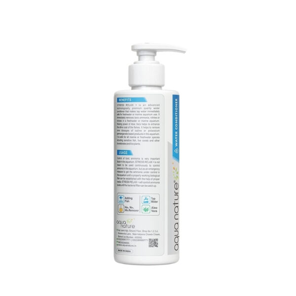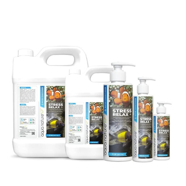 Aquanature Stress Relax + is an advanced, technologically developed, premium quality water conditioner that makes tap water immediately safe for freshwater or marine aquarium use. It instantly removes toxic ammonia, nitrites, and nitrates in both freshwater and marine aquariums. The added Aloe Vera helps enhance the natural slime coat of fish. It also helps remove overdoses of iodine or potassium permanganate–based products in the aquarium. Aquanature Stress Relax + is safe for all marine and freshwater species, including sensitive fish, live corals, other invertebrates, and live plants.