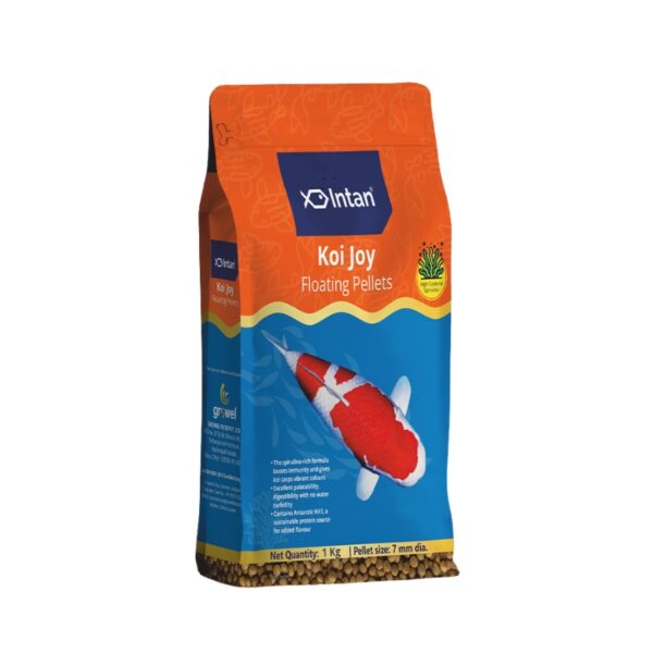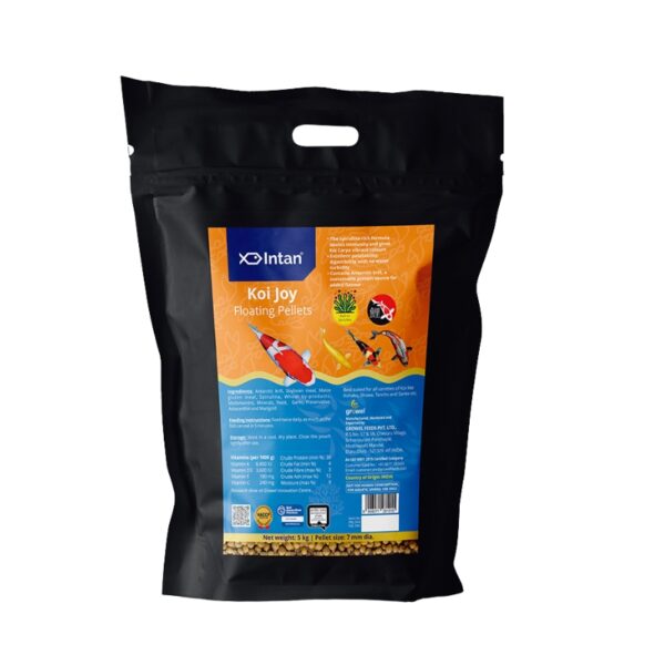 Intan Koi Joy Pellets (Floating Pellets), a Highly Nutritious Ornamental Fish Food with 38% protein, are specifically formulated for all types of Koi fish. Made from an exclusive blend of special ingredients, this food is scientifically developed to enhance overall health, growth, immunity, colouration, & body shape. The high-quality protein content ensures the development of new tissues, robust muscle health, & strength. These pellets boost the overall vitality & energy of Koi carps, supporting a joyful & long lifespan.