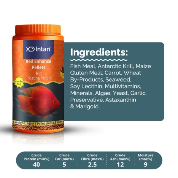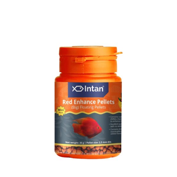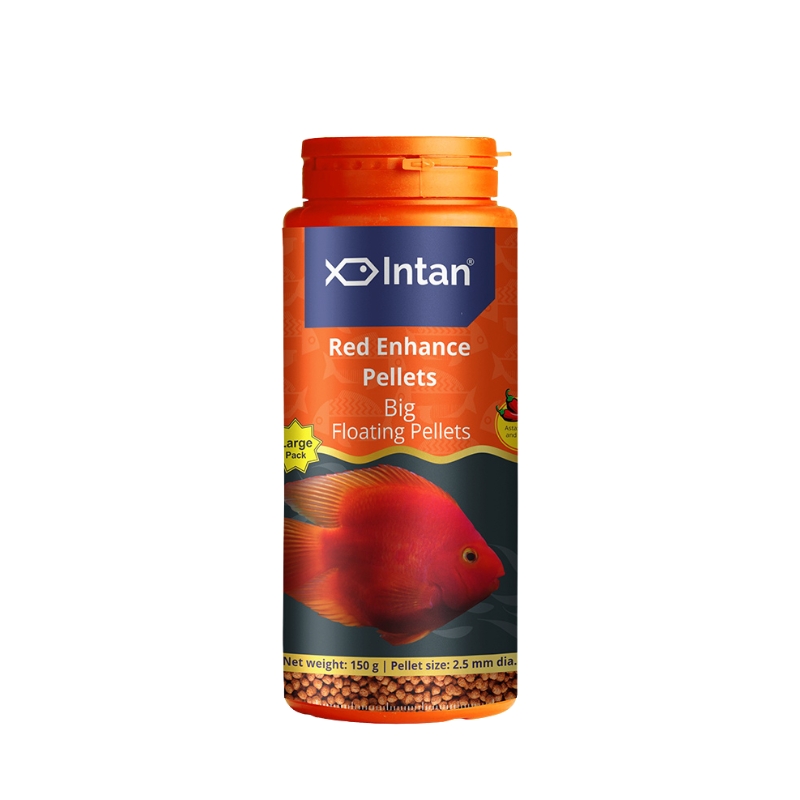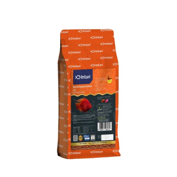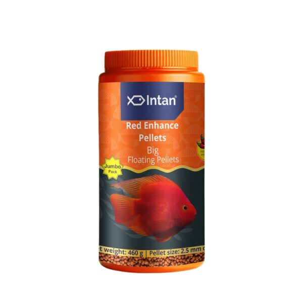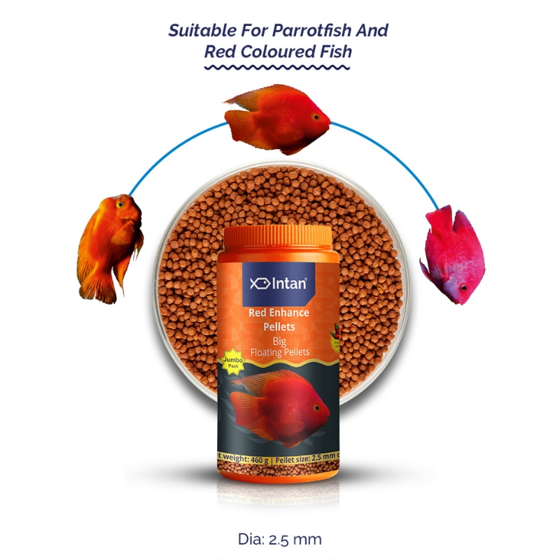 Intan Red Enhance Pellets (Big Floating Pellets), a Highly Nutritious Ornamental Fish Food with 40% protein, are specifically formulated for Parrotfish & other red-coloured fish. This balanced diet is designed to intensify the red pigmentation in fish, achieved through the addition of natural Astaxanthin & de-seeded Kashmiri chilies. The wholesome nutrition provided by these pellets promotes healthy feed intake, enhanced digestibility, & disease resistance.– Astaxanthin & paprika contribute to the intense red colour of the fish